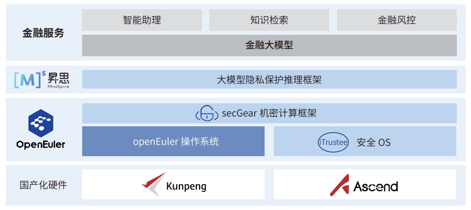 高安全:基于 openEuler 机密计算技术,增强现有大模型业务系统的数据安全和隐私保护,在工商银行金融智能助理和 知识检索场景开展试点;